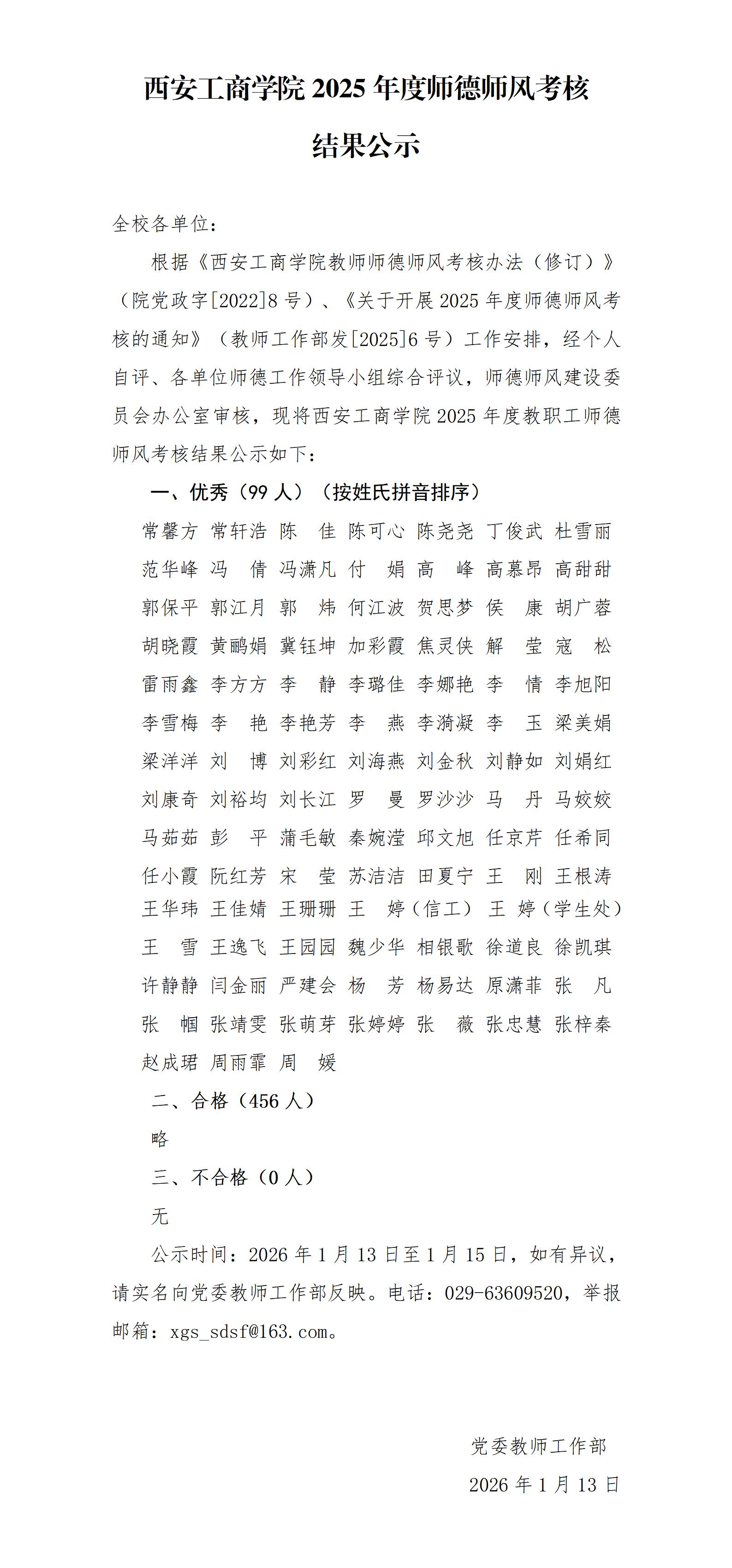 西安工商学院2025年度师德师风考核结果公示